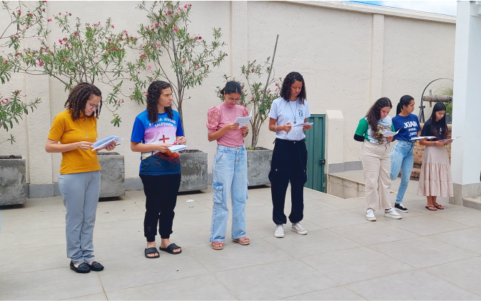 Na continuidade da programação, Ir. Rita Cristina trabalhou o tema “Peregrinos, porque chamados”, iluminado por Romanos 5,5: “A esperança não decepciona.” Em clima de caminhada e simbolismo, o grupo seguiu até o espaço Madre Mazzarello, onde recordou a vida de jovens santos e beatos, São Domingos Sávio, Carlo Acutis, Laura Vicuña e Chiara Luce Badano, exemplos de vocações vividas com autenticidade e alegria na amizade com Cristo.
